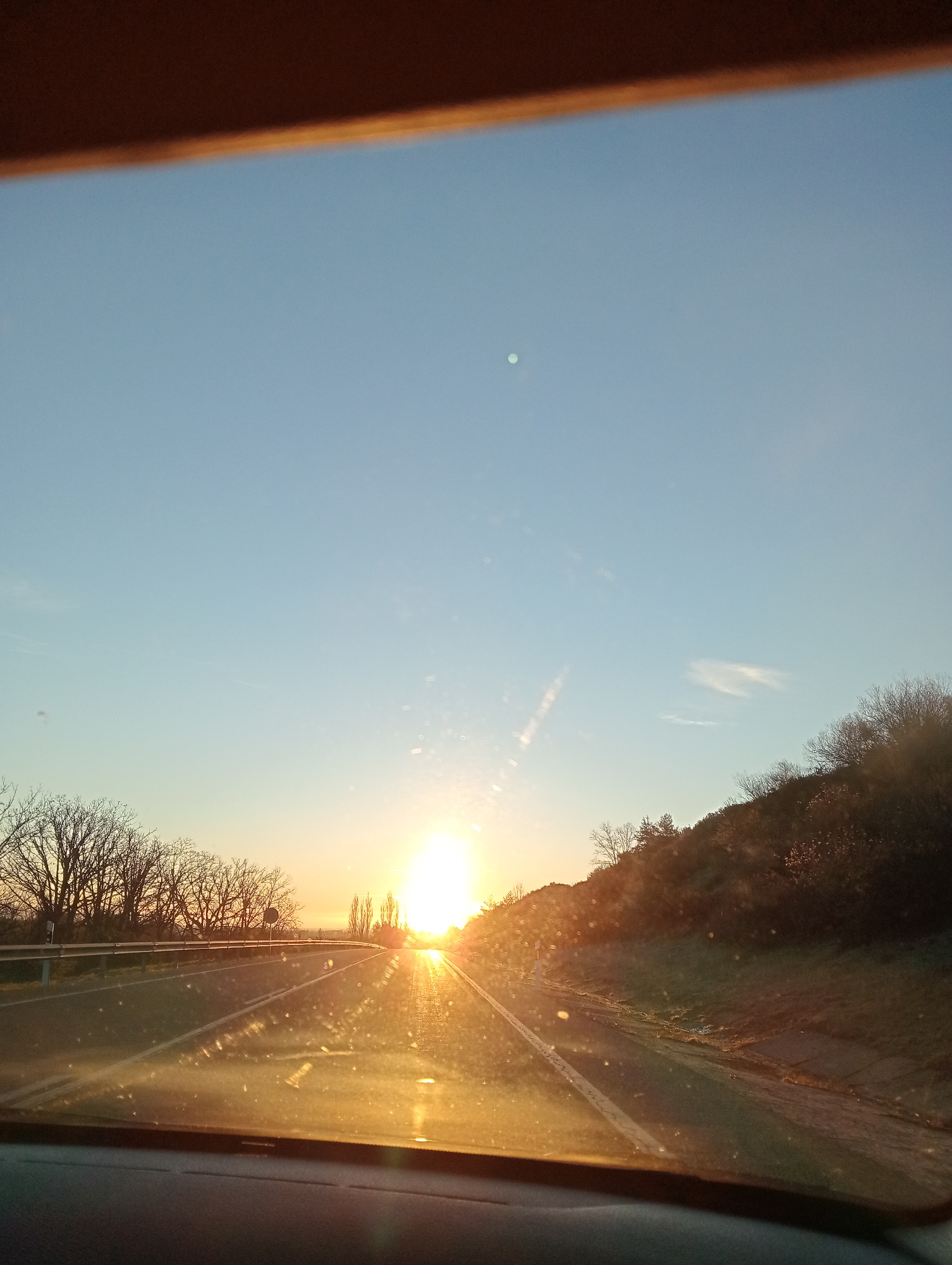 The scene is located in Villatoro, Spain, captured from inside a vehicle looking forward through the windshield. The sun is low on the horizon, directly ahead, indicating either sunrise or sunset, and creating an intense lens flare across the dirty windshield. Numerous dust particles or water spots are visible on the glass. An asphalt road with white lane markings extends into the distance, with the sun's glare reflecting prominently off its surface. To the left, a metal guardrail runs alongside the road, behind which a line of leafless deciduous trees is silhouetted against the sky. A circular road sign is partially visible behind the guardrail on the left. To the right, a grassy embankment slopes upwards, sparsely covered with bare trees and shrubs. The sky above is clear blue with a few faint wisps of clouds, and a distinct green circular lens artifact is present in the upper left portion of the frame. No individuals or other vehicles are discernible within the image.