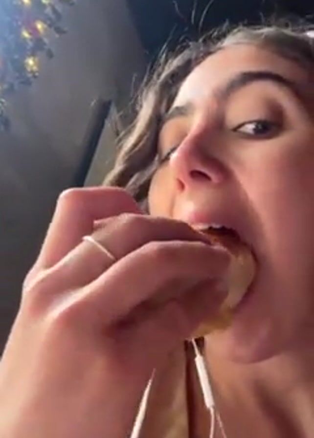 A person with curly brown hair, wearing white earphones and a beige top, takes a bite out of a sandwich. The person has fair skin and a silver ring on their left hand. The sandwich has multiple layers and a golden crust. A decorative light fixture hangs overhead. The person chews with their mouth closed and makes a pouting expression.