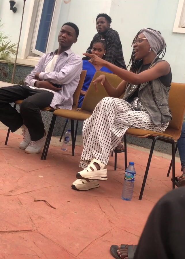 A group of people are sitting on chairs in an outdoor setting. The area is paved with red bricks. The people are dressed in casual clothing. A woman wearing a headscarf and patterned pants is talking and gesturing with her hand. A young man in a striped shirt is sitting next to her with his arms crossed. A water bottle is on the ground next to each of them. Behind them, two other individuals are standing. A plant in a pot is next to the building. A bicycle is visible behind the seated individuals. The building has a light blue facade.