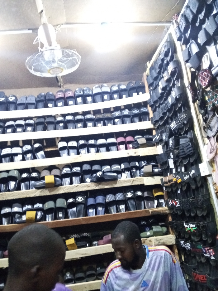 A brightly lit shop showcases wooden shelves overflowing with neatly arranged sandals and slippers. Predominantly black, the footwear varies in design, with some featuring patterns and embellishments. A light fixture and a fan hang from the ceiling. Two people are partly visible at the bottom of the frame.