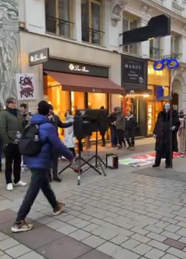 The scene is a pedestrian area lined with shops. Several people are gathered around a man standing at a microphone in front of a black speaker. Another person, dressed in a dark robe with a skeletal face mask, stands nearby. A person holds a sign that says "FCK FUR". People are walking past the group, including a woman pushing a stroller. The shops in the background have awnings and lighted windows. The street is paved with patterned bricks.