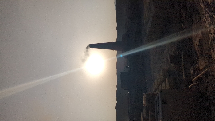 This image depicts an industrial landscape, specifically a brick kiln operation, located in the city of Kuchlak, Pakistan. The scene is illuminated by a low sun, possibly during sunrise or sunset, which generates a prominent diagonal lens flare across the frame. In the foreground, the ground is dark, uneven, and appears to consist of soil and debris. Visible are several rectangular blocks and multiple stacks of uniform, light-colored objects consistent with unfired bricks. A section of tubing or piping is present on the ground. The mid-ground features a tall, reddish-brown, conical brick kiln chimney, positioned right of center, from which a plume of dark smoke actively rises. To the left of the chimney, a lower, darker, rectangular building is visible. The background consists of a range of dark, undulating hills or mountains forming the horizon. The sky is light grey and appears hazy. No individuals are clearly discernible in the image.