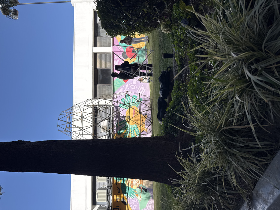 The scene depicts an outdoor area in San Andrés Cholula, Mexico, under a clear blue sky. A large, dark-barked tree occupies the left foreground, casting a prominent shadow. Ornamental plants with variegated green and white foliage are present at the base of the tree and across the immediate foreground. The midground features a manicured green lawn where a conical metal geodesic frame, constructed from interconnected thin rods, is erected. Three individuals are positioned around this structure. Two individuals, dressed in dark clothing, stand closely together, facing the frame. A third individual, wearing a light-colored top and white pants, stands further to the right of the frame. Several dark bags and a black cup are visible on the grass near the base of the tree and the frame. In the background, a white building features multiple horizontal windows and external air conditioning units. A vibrant mural covers the lower section of the building's wall, displaying colorful geometric shapes, abstract designs, and a stylized yellow and green turtle-like character on the left side. The scene is illuminated by bright daylight, producing distinct shadows.