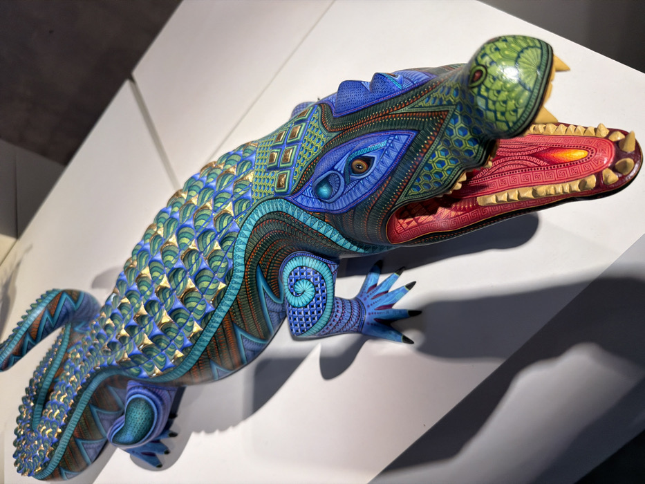 An intricately carved and painted wooden sculpture of a crocodile rests on a white surface