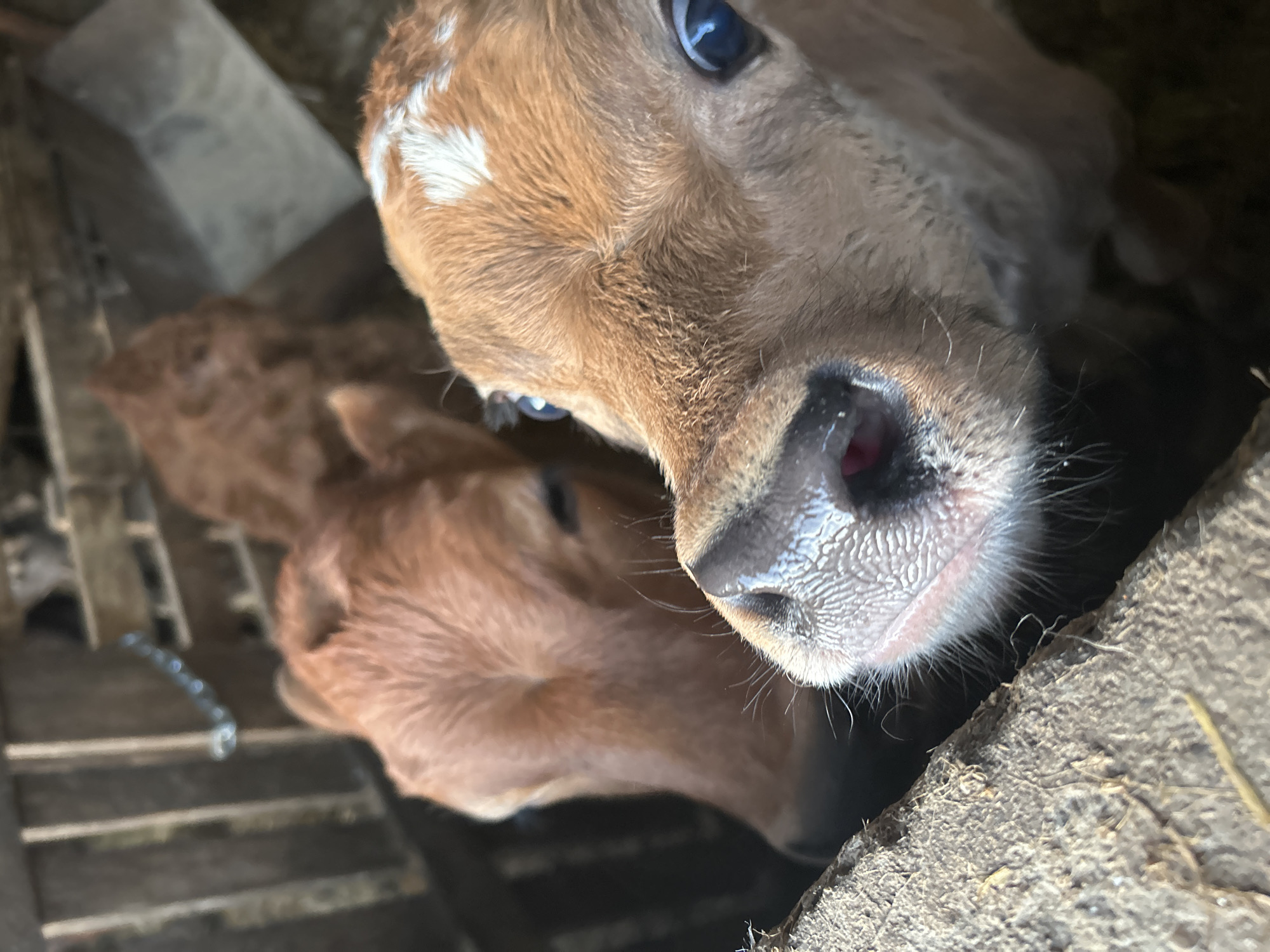 Two brown calves are in a barn in Isperih, Bulgaria. The calf in the foreground has a white spot on its forehead and is peering curiously at the camera. The second calf is behind the first and slightly to the left. The barn has wooden plank walls.