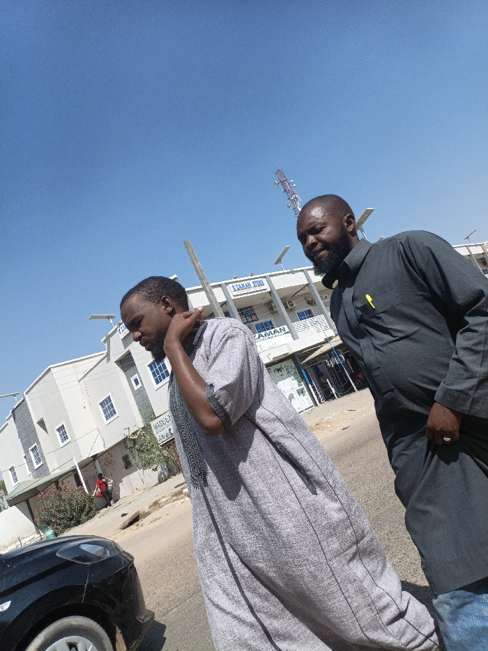 The image captures an outdoor street scene in Tarauni, Nigeria, under a clear, bright blue sky with direct daylight. Two adult males are central in the foreground. On the left, a dark-complexioned male with a short beard wears a light grey thobe (tunic) featuring dark embroidered trim around the neckline. His right hand is positioned near his right ear/neck area, and his gaze is directed downwards. To his right, a second dark-complexioned male with a dark, full beard is partially visible, wearing a dark grey long-sleeved button-up shirt with a yellow pen clipped into his left breast pocket, and blue denim jeans. He wears a metallic ring on his left ring finger and looks towards the left side of the frame. Both individuals are located on a paved asphalt street. In the immediate foreground on the far left, the front bumper and a portion of the wheel of a black vehicle are visible. A light-colored utility pole stands vertically between the two prominent males. In the midground, the street features a visible drain or manhole cover. Buildings line the street, including a multi-story structure with a prominent blue sign displaying 'A. ZAMAN STORI' and blue-framed windows. To its left, another multi-story building with light-colored walls and grey accents features multiple white-framed windows. Retail shopfronts are discernible at street level within these structures. Solar-powered streetlights are mounted on poles along the thoroughfare. Green foliage and bushes are present near the building foundations. In the far background on the left, a third individual wearing a red shirt is visible walking on the sidewalk. Against the clear sky in the upper right quadrant, a red and white cellular tower is visible in the distance. No explicit interaction between the two main subjects is discernible.