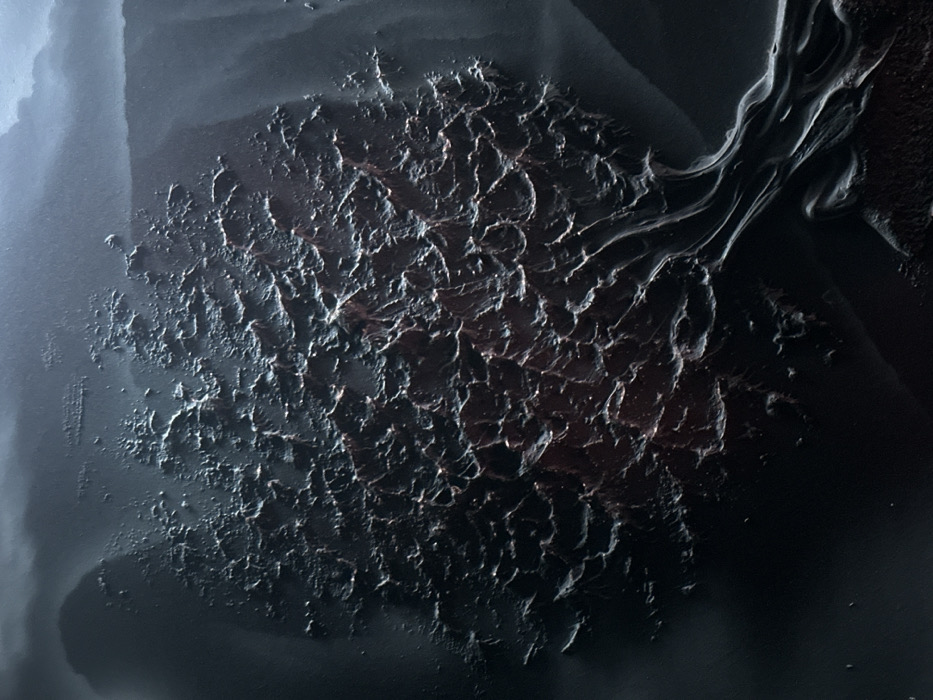 A textured, dark, seemingly barren landscape dominates the image. The central area features a dense network of interconnected ridges and valleys, illuminated by a subtle light source. To the left, a smoother, slightly lighter area suggests a different terrain type. Vein-like structures emanate from the central textured zone, further emphasizing the intricate and harsh nature of the depicted environment. The image evokes a sense of isolation and ruggedness.