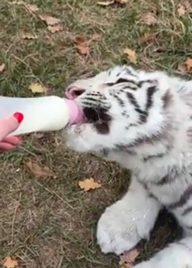 - "A white tiger cub is lying on grass and being fed milk from a baby bottle by a person with red nail polish" by FM-2g8Zp2, licensed under CC BY 4.0