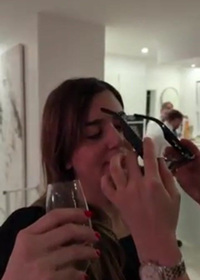 In a bright, indoor setting, a woman with shoulder-length brown hair and red nail polish is being fitted with black sunglasses by another person. She holds a champagne flute in her left hand. A gold watch is visible on her left wrist. A painting hangs on the wall behind her, and a kitchen area with people is visible in the background. The person fitting the sunglasses is out of focus. The woman smiles slightly as she puts on the sunglasses.