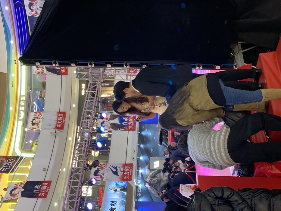 The scene depicts an indoor event taking place on a multi-level shopping mall's ground floor, located in Taihe District, China. A raised red platform, functioning as a stage, is central to the foreground. On this platform, a woman with long dark hair, wearing a light-colored sleeveless top, stands while looking at a smartphone held in her left hand and grasping a golden microphone in her right. To her right, a man in a dark suit jacket stands facing her. To their left, two individuals are bent over the red platform: one woman with long dark hair wearing a brown jacket, blue jeans, and tan boots; and another person in a grey and white striped sweater and dark pants. They appear to be engaged with objects on the platform. Beyond the platform, a crowd is gathered behind red rope barriers, observing the event. A red compact SUV is partially visible on a display area behind the main subjects. Above the stage, a metal truss structure supports multiple stage lights, emitting purple and blue light. Numerous vertical banners featuring a male celebrity (Xiao Zhan) and the Chinese text "实力演员" (Powerful Actor) are suspended from the mall's upper levels and the truss. The mall interior features curved railings on multiple floors and a circular, multi-colored ceiling. A large black vertical panel, likely stage equipment, is visible on the far right of the frame.