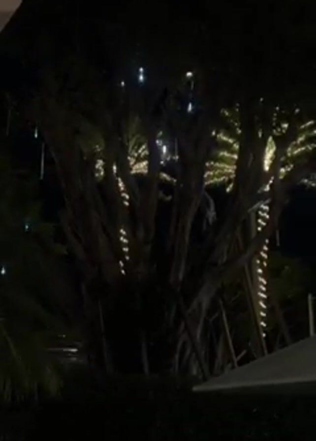 large, dark tree at night. The tree has lights hanging from its branches and trunk. In the background, there are other trees, some with lights, and a building. In the foreground, there is some greenery and part of a white umbrella. Someone speaks in the background.