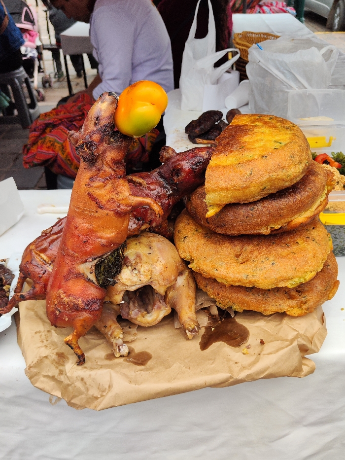 This image depicts a street food stall in Cuzco, Peru. The foreground is dominated by a display of cooked food arranged on brown butcher paper, which rests on a white tablecloth. Central to the display are at least two whole roasted guinea pigs (cuy); one stands vertically, balancing a partially ripe yellow and green tomato on its head. Adjacent to these are a roasted chicken carcass and several pieces of dark, charred meat. To the right, a stack of five large, round, fried items, resembling savory pancakes or fritters, is prominent; some are yellowish-green, others a darker golden-brown. Small puddles of drippings are visible on the butcher paper. In the background, a person wearing a light purple long-sleeved shirt is partially visible, facing away from the camera, positioned behind the food display. The wider environment includes other market elements such as white plastic bags, a woven basket, and clear plastic containers on the table, indicating an outdoor market or street vendor setting.