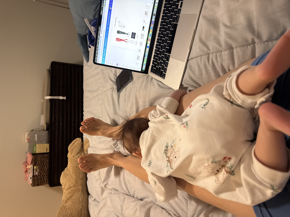 - "On a bed, a baby lies on a person's legs, facing away from the camera, wearing a white onesie with a koala print" by FM-nWMn13, licensed under CC BY 4.0