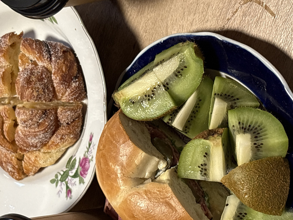 This image depicts a static indoor scene of food and beverages arranged on a light-toned wooden surface, located in Tel-Aviv, Israel. In the foreground, a dark blue ceramic plate with a white rim holds a half-eaten bagel sandwich, sliced horizontally to reveal fillings that include cured meats and possibly lettuce or a spread. Adjacent to the bagel, numerous slices of kiwi fruit are arranged, cut into wedges and half-rounds, displaying their green flesh and black seeds. A piece of brown kiwi skin is also visible. In the midground, a white ceramic plate with a pink and green floral pattern holds a large, golden-brown, segmented pastry, which appears to be sugar-dusted. Partially visible on the right, a dark-colored disposable cup with a black lid suggests a beverage. No individuals are present in the frame.