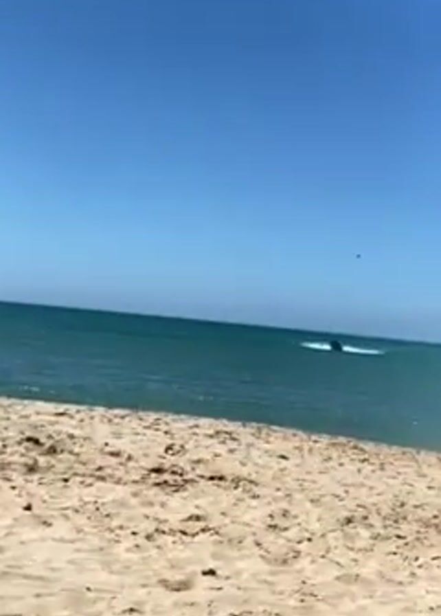 beach on a sunny day with a bright blue sky. The sand is light brown. The water is turquoise. A blue boat with a single person on it is moving towards the shore in the distance. A bird is flying overhead.
