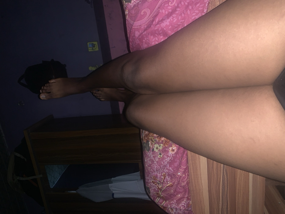 The image features a person's bare legs crossed on a bed with a pink floral patterned blanket. The skin tone is dark. To the left, there's a dark-colored backpack hanging from a wooden structure, possibly a bunk bed or a cabinet. The wall behind the furniture is a dark color with what appears to be a light switch. The overall lighting is dim, contributing to the dark and shadowy atmosphere. The viewpoint is from above, looking down at the legs on the bed.