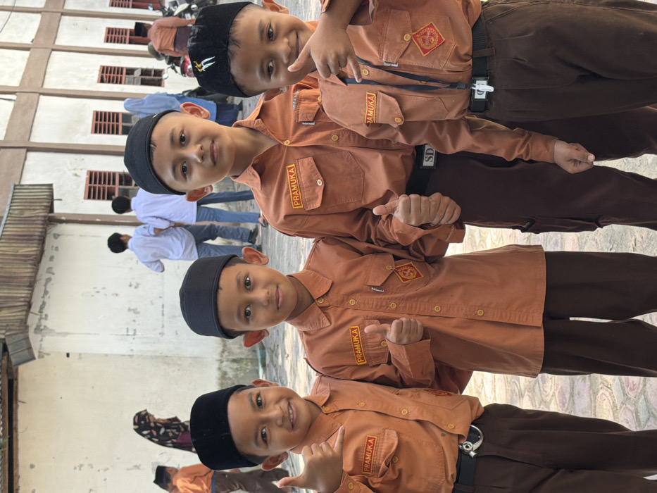 Four smiling boys in brown scout uniforms and black caps pose vertically. They stand close together, each giving a thumbs-up. Behind them, blurred figures in white shirts and jeans walk past a building with small, square windows. A motorcycle is parked nearby. The background is a mix of buildings, people, and vehicles, suggesting a school or community setting.