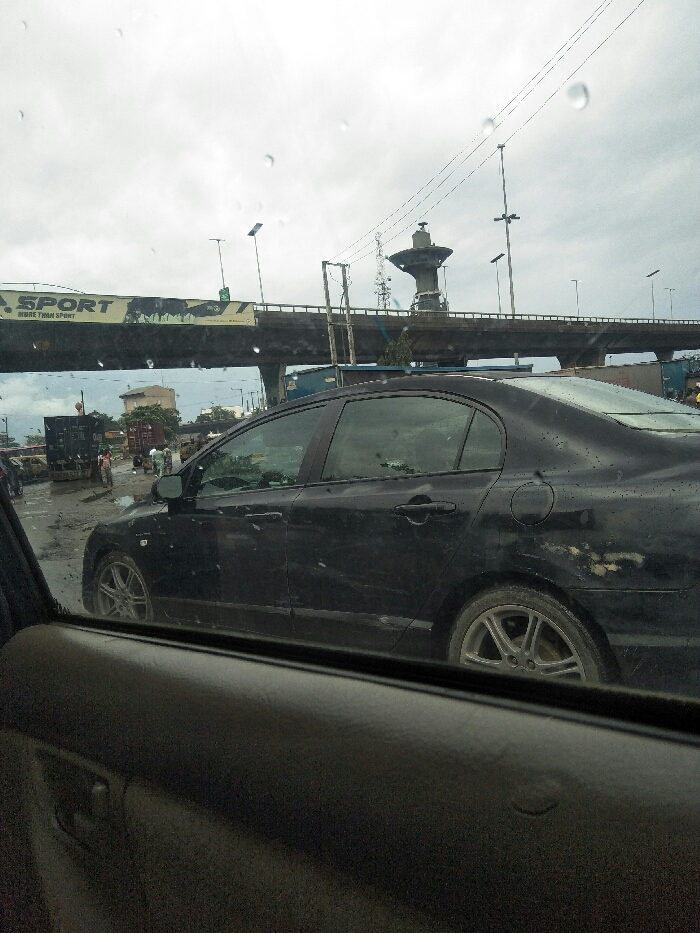 The image provides a forensic view from inside a vehicle through a rain-splashed window, depicting an urban street scene in Ebute-Metta, Lagos, Nigeria, under an overcast sky. **Location and Environment:** The scene is characterized by a prominent elevated concrete flyover spanning the mid-ground, displaying a green and black banner with the text "A. SPORT MORE THAN SPORT." To the right of the flyover, a distinctive cylindrical water tower, a known landmark in Ebute-Metta, rises in the background. The road below the flyover appears unpaved and muddy in sections, indicative of current or recent rainfall. Tall streetlights and utility poles with overhead wires are visible throughout. **Subjects and Objects:** 1. **Foreground:** The dark-colored dashboard or door panel of the observer's vehicle is visible in the lower portion of the frame. Rain droplets are evident on the exterior of the observer's window. 2. **Mid-ground:** A dark-colored (likely black or dark blue) four-door sedan, consistent with a Honda Civic, occupies the left side of the frame, positioned parallel to the observer's vehicle. This vehicle displays notable cosmetic damage, including extensive paint scuffing and missing paint exposing a lighter undercoat on its rear passenger door and quarter panel. It is fitted with multi-spoke grey alloy wheels. 3. **Background:** Beyond the sedan, multiple individuals (pedestrians or street vendors) are visible standing or moving on the unpaved road. Several other vehicles, including a large dark-colored truck or container vehicle, are partially obscured on the far left. **Actions and Interactions:** The presence of multiple vehicles and pedestrians suggests ongoing traffic and human activity in the urban street environment. The vehicles appear to be stationary or moving slowly, consistent with typical city traffic.