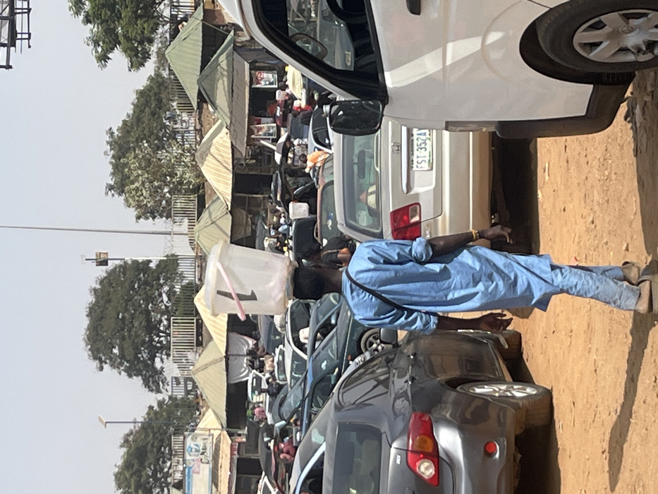 A male individual walks through a dusty, reddish-brown market area in Nyanya, Nigeria