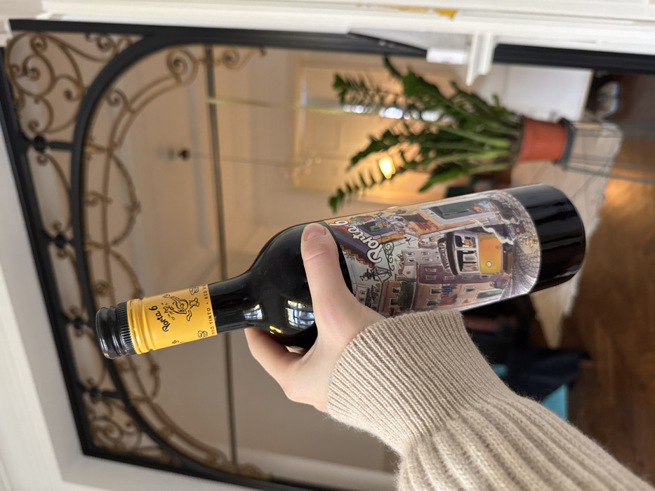 A light-skinned hand, adorned in a light beige ribbed long-sleeved sweater, holds a dark glass bottle of "Porta 6" red wine