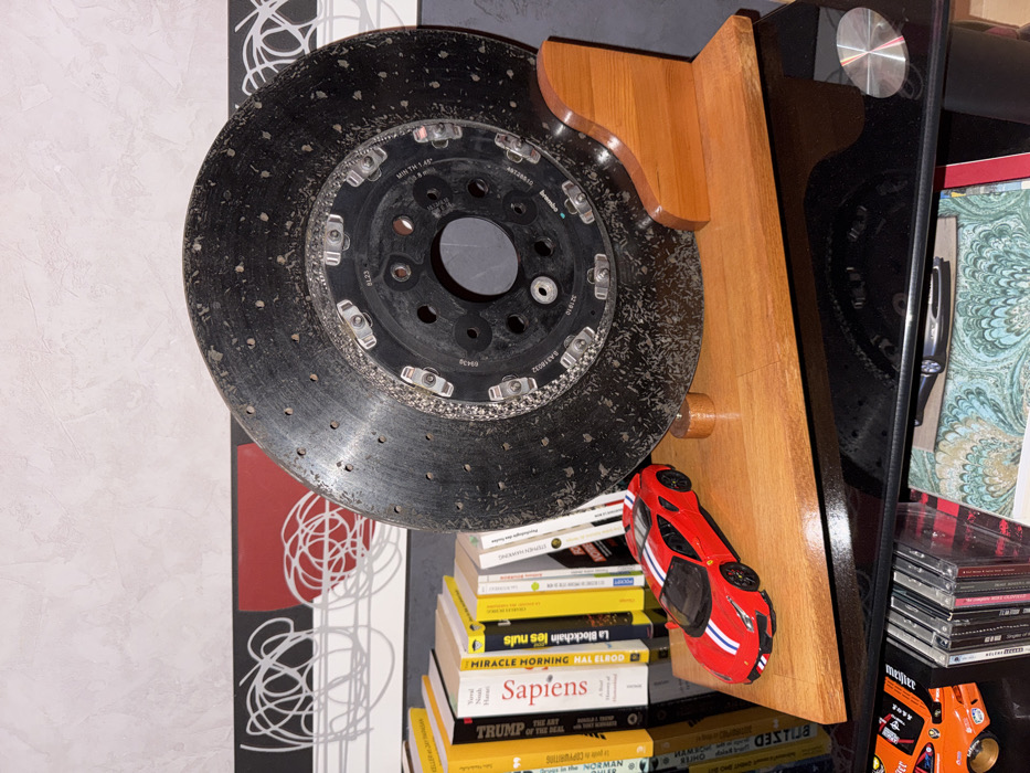 - "A brake rotor is mounted on a wooden base and displayed on a shelf amidst books, CDs, and decorative items" by FM-vKWxk2, licensed under CC BY 4.0