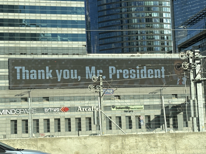 The image displays an urban scene in Tel Aviv, Israel, likely along the Ayalon Highway, characterized by modern infrastructure and high-rise buildings. In the mid-ground, a prominent black digital billboard features the light blue text, "Thank you, Mr. President." The text is centered, and small white pixel artifacts are visible across the display. Partially obscuring the billboard and the buildings behind it are multiple horizontal overhead power lines and a vertical metal support pole with several circular spools/pulleys, indicative of a railway or light rail catenary system. Below the billboard, a multi-story building with a light-colored facade and numerous vertical windows is visible. Commercial signs are affixed to this building: "MINDSPACE" on the left, "פעילים" (Peilim) with a red arrow logo in the center (followed by "להשקעות" - for investments), and "Arcaffe" on the right. Another sign, "balagerilly café," is partially visible further right. In the background, two tall, contemporary glass-clad skyscrapers reflect the sky and surrounding light. The building on the left features a pattern of horizontal glass and concrete bands, while the one on the right is largely glass. The foreground consists of a rough, light-colored concrete barrier. The top-left corner of a light blue or silver vehicle is partially visible at the bottom left of the frame. The scene is illuminated by daylight, with no discernible people present.