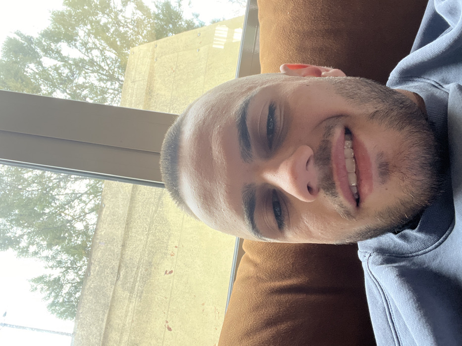 A young adult male, of light skin tone, with a short buzz cut and trimmed beard stubble, is depicted in a close-up selfie