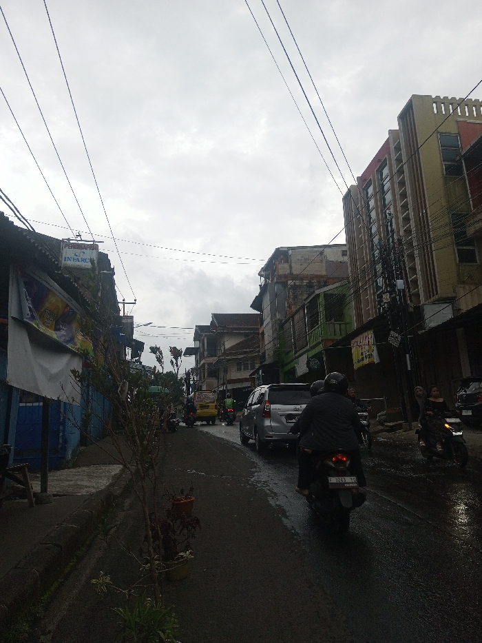 The image depicts an urban street scene in Sindanglaya, Indonesia, under an overcast sky. The asphalt road, wet from recent precipitation, extends into the background, flanked by buildings on both sides. In the immediate foreground, a dark-colored motorcycle, license plate F 3243 YO, is positioned with its rear visible, carrying two individuals wearing helmets. Ahead of the motorcycle, a silver SUV is parked or moving slowly. Further down the street, a yellow van and additional motorcycles are visible. On the left, a concrete sidewalk borders the road, displaying potted plants and thin, leafless shrubs. Buildings with corrugated roofs and visible signs, including "PERJAPAK" and "INMARCH," line this side. A building with a blue lower section is also present. On the right, taller, multi-story buildings stand, one featuring a distinct yellow-beige facade with vertical red-brown accents and multiple windows. Numerous black electrical and communication cables are strung overhead, crisscrossing the upper portion of the frame. On the right sidewalk, two women are visible, one in a dark dress, and another motorcycle is parked or moving. The overall environment suggests a busy commercial or residential street.