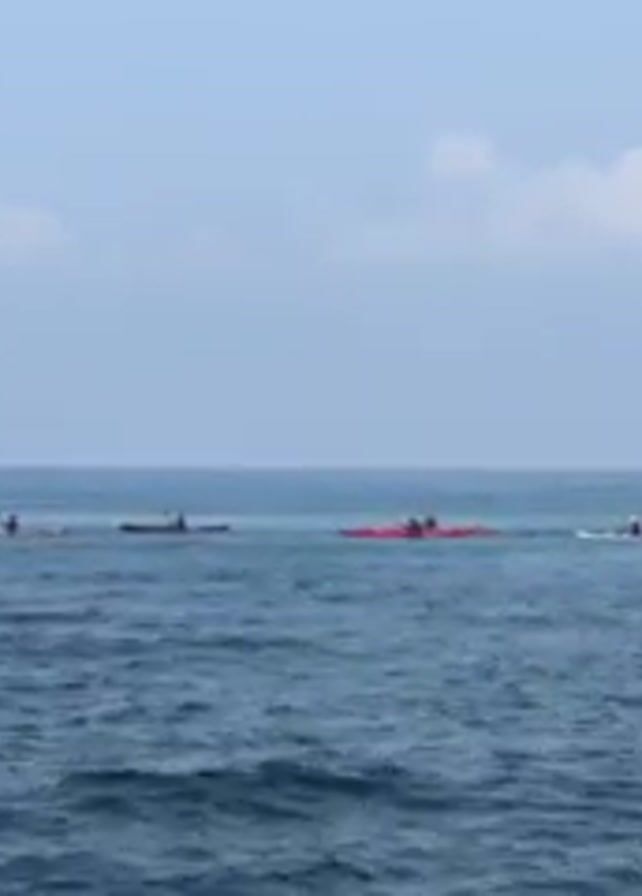 The scene is a wide shot of an open body of water, presumably the ocean, under a light blue sky with scattered clouds. Several kayaks, each carrying one or two people, are dispersed across the water. The kayaks vary in color, including red and light blue. An orange buoy is visible in the water. The water has a slightly choppy texture, with small waves. The general impression is one of a kayaking event or a group of kayakers enjoying the water.