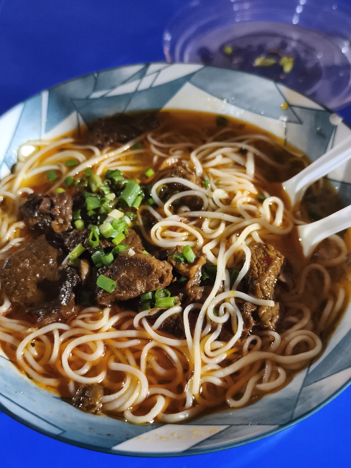 The image displays a close-up, high-angle view of a bowl of noodle soup, likely taken in Coronel Gregorio Albarracín Lanchipa, Peru. The bowl, featuring a light blue and white geometric pattern on its rim, contains white, thin, round noodles submerged in a reddish-brown broth with visible oil slicks. Several chunks of dark brown, braised meat are distributed throughout the soup. A garnish of chopped green onions is scattered over the meat and noodles in the center. Two white plastic spoons are partially visible, one on the right side of the bowl, partially immersed in the broth. In the upper right background, a translucent plastic container with a small amount of dark material and a few green specks is partially visible. The entire bowl rests on a vibrant blue surface.