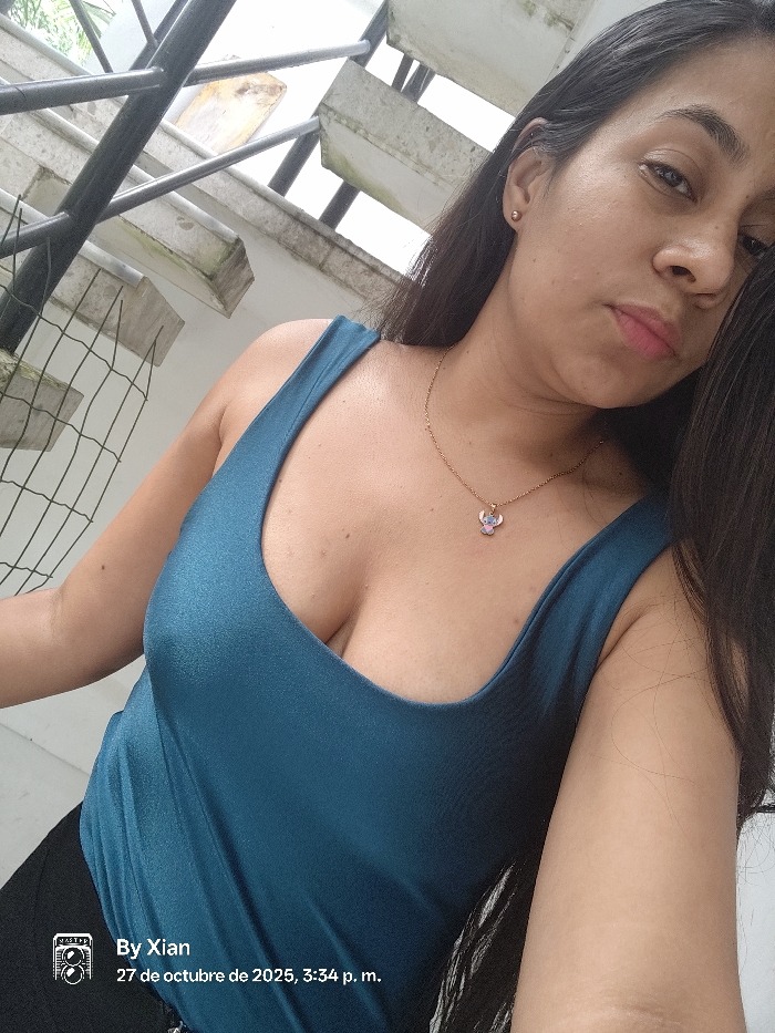 The image depicts a female subject, positioned for a close-up selfie, against an urban architectural background. The subject, an adult with long, dark hair parted to her right, occupies the majority of the frame, from the mid-chest upwards. She wears a dark teal tank top with a scoop neck, exposing her décolletage. A thin, gold-colored chain necklace with a light blue and pink "Stitch" character pendant is visible around her neck. Both earlobes feature small, round stud earrings. Her expression is neutral, with her gaze directed slightly away from the camera's center to the right. Her lips are closed, showing a subtle pink tint. The background consists of light-colored, possibly concrete, building elements showing some weathering, along with dark metal railings or balustrades. A dark mesh or netting is discernible on the far left. The perspective suggests an elevated position, possibly on a staircase or balcony. The lighting is even, indicating an outdoor or semi-outdoor setting. No specific landmarks are visible to pinpoint a precise location within Cali, Colombia; however, the architectural style is consistent with residential or multi-story urban structures found in the city. The lower left corner of the image contains an overlay with text: "By Xian 27 de octubre de 2025, 3:34 p. m."