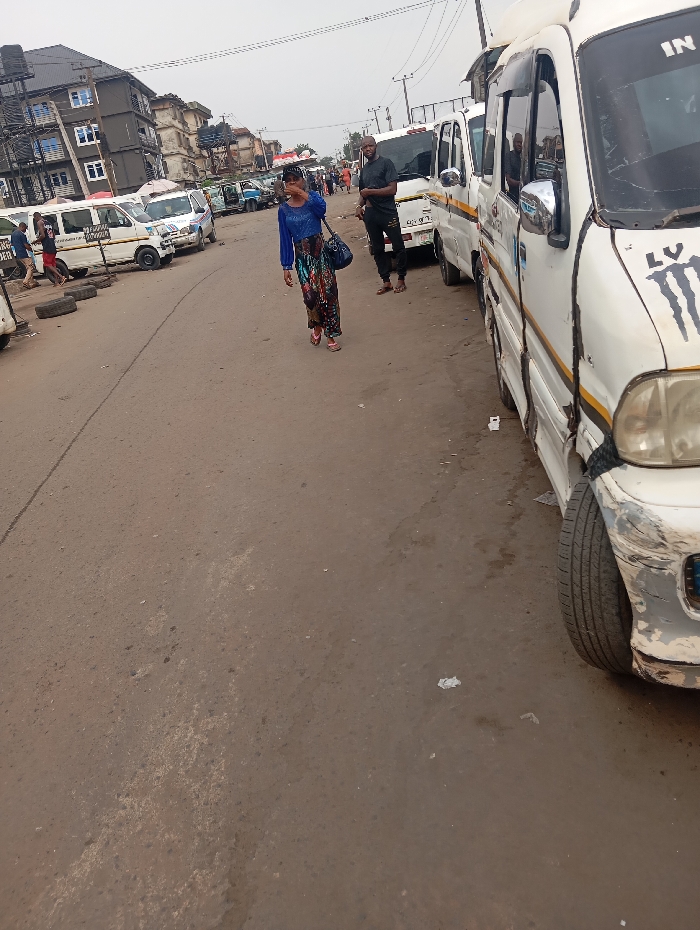 The image displays a bustling urban street scene in Onitsha, Nigeria, characterized by parked vehicles and pedestrian activity under an overcast sky. The foreground features a worn, brown asphalt road. On the right, a line of white commercial passenger vans, some marked with yellow side stripes, are parked parallel to the road. The closest van has a significantly damaged white front bumper, revealing internal components, and displays a partially visible "Monster" logo on its front panel. In the mid-ground, a female subject walks from left to right across the frame, facing slightly towards the camera. She wears a blue long-sleeved top, multi-colored patterned trousers, and red footwear, carrying a dark shoulder bag on her left side. To her right, a male subject stands next to another white van, dressed in a black shirt and black trousers, looking directly towards the camera. The background shows additional white vans and numerous pedestrians, suggesting a transportation or commercial hub. Multi-story concrete buildings, some appearing partially constructed or renovated, line both sides of the street further down the road. Overhead utility lines and poles are visible across the upper portion of the frame. Discarded tires are present on the left side of the road near other parked vehicles and individuals.
