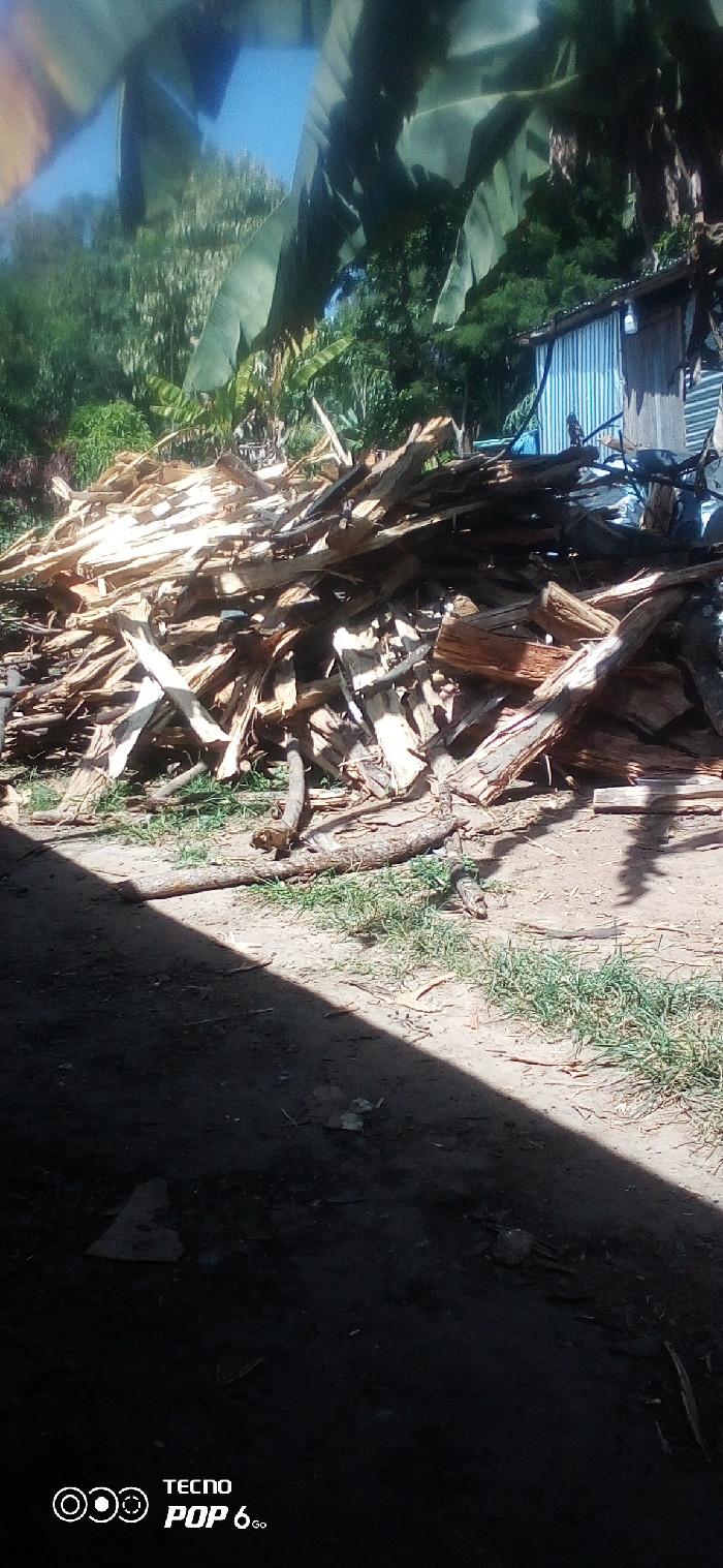 An outdoor scene in Mahiakalo ward, Kenya, is dominated by a substantial pile of split wood, likely firewood, located in the mid-ground and extending into the right