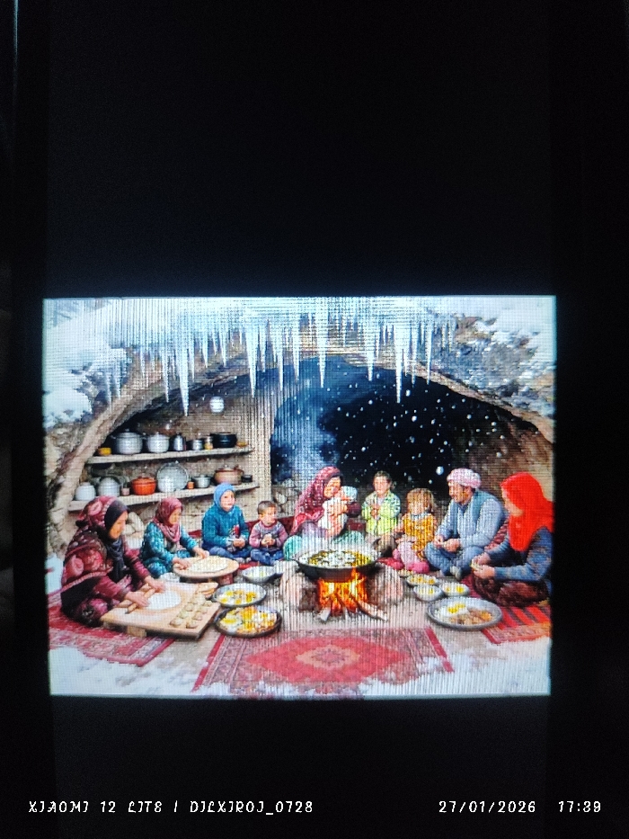 - "The image displays a photograph of a digital display showing a rendered scene of a large family gathering inside a natural rock shelter or cave entrance, located in the city of Abikanda, Uzbekistan" by FM-2RtQ72, licensed under CC BY 4.0