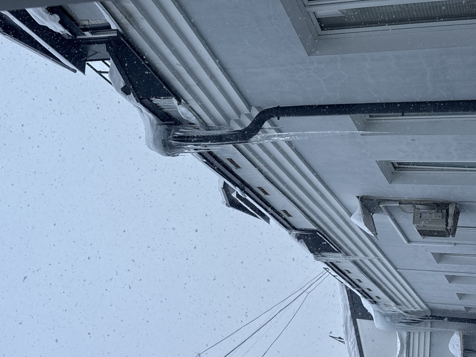 The image depicts a building facade in Moscow, Russia, during a heavy snowfall. The sky is overcast and populated with numerous falling snowflakes. The structure presents a light-toned exterior, likely pale blue or white, featuring horizontal decorative banding below a dark-colored roof. Significant snow accumulation covers the roof and its gutters. A prominent dark downspout descends vertically from the upper right, heavily adorned with a large icicle formation that extends several feet downward. Additional, smaller icicles hang from other sections of the roofline. An external air conditioning condenser unit, partially obscured by snow, is mounted on the wall below a snow-covered hooded exhaust vent. Multiple windows are visible along the building's facade. Utility lines traverse the upper left quadrant of the frame. No individuals or active subjects are present within the scene.