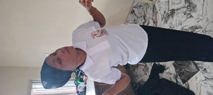 A woman stands indoors with a marble-patterned floor. She wears a white collared shirt with a logo on the left side and black pants. She also has a dark blue head covering. A light-colored wall is behind her. A partial view of a window is visible on the left, with a shelf or table below it. A bit of what appears to be a dark object rests in the floor behind her. The image appears tilted.