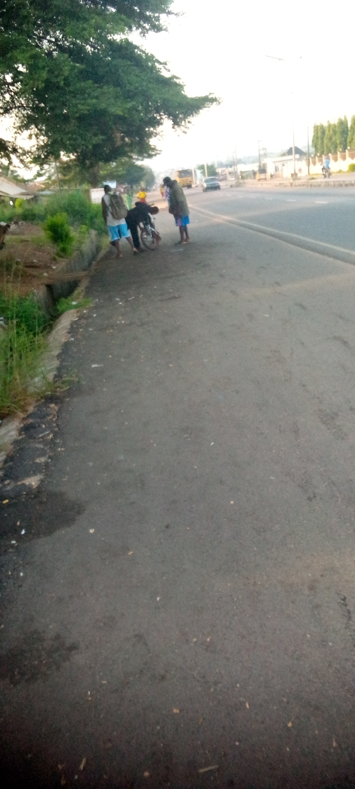 Three men are gathered by a motorcycle on the side of a paved road. One man, wearing a yellow helmet, is next to the motorcycle, while the other two stand nearby. The road runs parallel to a grassy shoulder and a drainage ditch. A large tree stands adjacent to the men, providing shade. In the background, there is traffic and some buildings under a bright sky.