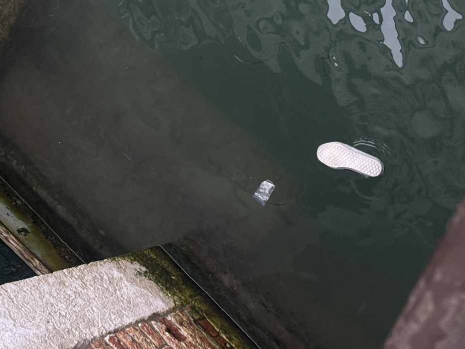 The image captures a dark green canal in Venice, Italy, observed from an elevated perspective, likely a bridge or a walkway, with a partial brown structure visible in the lower foreground. To the left, a canal bank is visible, constructed with red brickwork topped by a lighter stone foundation, both sections showing growth of green algae or moss at the waterline. Two distinct objects float in the tranquil water: a white shoe sole, possibly from a sneaker, displaying a textured surface and oriented face-up in the mid-right portion of the frame; and a small, transparent plastic bag or container, appearing partially inflated and resembling a Ziploc bag, situated to the upper-left of the shoe sole. Scattered strands of dark aquatic vegetation are present in the water, particularly near the plastic object. The water surface exhibits subtle ripples and reflections under ambient light. No individuals are visible within the scene.