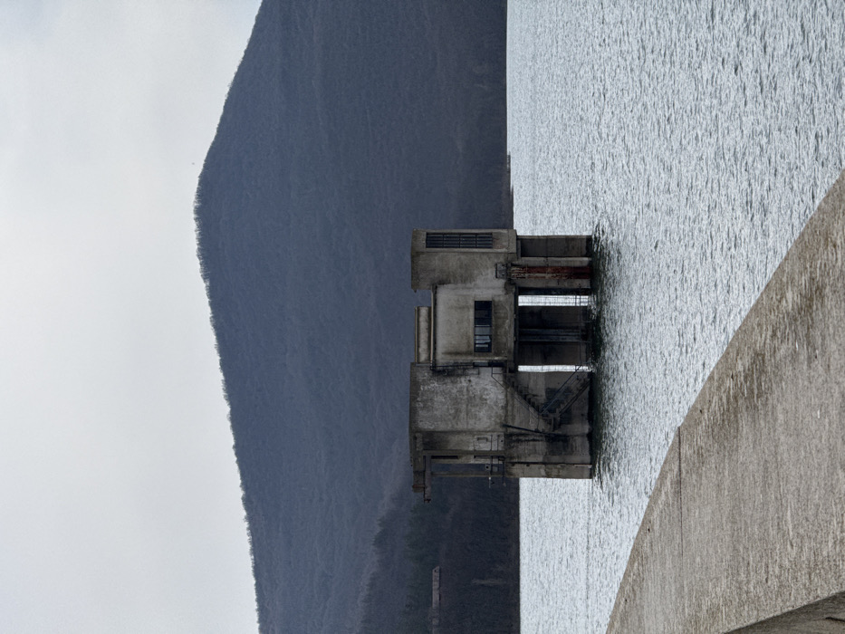 The image displays an abandoned, multi-level concrete structure, identified as a former pumping station at Pyasachnik Dam, near the city of Баня, Bulgaria. The structure is situated centrally within a large body of water, supported by concrete pillars partially submerged beneath the water's surface. Visible on the left side of the building is an external concrete staircase descending into the water. The brutalist-style concrete exhibits significant weathering, including dark stains and streaks of rust. Multiple window openings are present, some appearing to retain glass panes, others open. In the foreground, a rough, grey concrete walkway or dam edge extends diagonally from the lower left towards the center of the frame. The water is a consistent grey-blue, showing minor ripples. The background features a large, dark blue-grey mountain range covered in dense, dormant deciduous trees, set against an overcast, light-grey sky. No individuals, animals, or active elements are depicted in the scene.