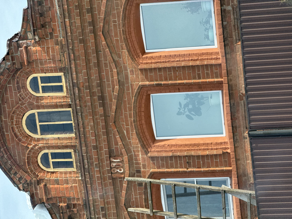 An exterior image depicts a section of a multi-story red brick building located in the city of Кварса, Russia. The building features ornate brickwork, including decorative cornices and arched window lintels. Centrally positioned above the lower-level windows, the year "1896" is inscribed in white brickwork. The upper visible level of the building presents three arched windows, each fitted with yellow-framed panes and a central vertical mullion, reflecting a dark, possibly clear, sky. Snow is present on the upper left edge of the roofline, indicating cold weather conditions. The lower visible level includes three rectangular windows. The window on the left is partially obscured by a weathered wooden ladder leaning against the brick facade. The central and right-most lower windows have white frames and display internal reflections of potted plants: a single large plant with dark leaves in a white pot in the central window, and multiple smaller plants in white pots in the right-most window. Below these windows, a brown corrugated metal fence with vertical panels and a dark support post runs horizontally, separating the building from the foreground. The scene is illuminated by natural daylight.