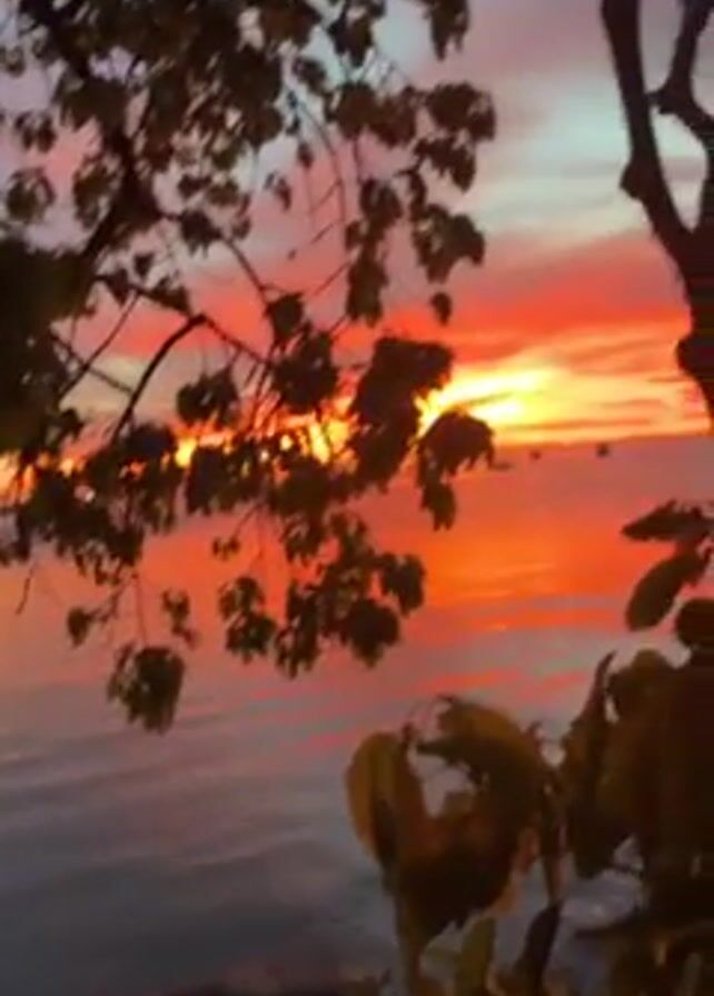 The video showcases a vibrant sunset scene over a body of water, likely the ocean or a large lake. In the foreground, there are silhouettes of tree branches and foliage, framing the expansive view. The sky transitions from deep reds and oranges near the horizon to lighter shades of pink and blue further up. The water reflects the vivid colors of the sunset, creating a shimmering effect. There are also a few distant boats visible on the horizon. The camera seems to be held by someone, as a brief glimpse of a hand holding an object, possibly a phone, is visible at the bottom.