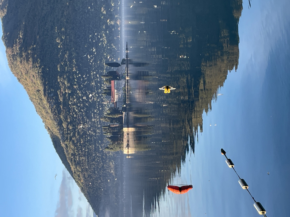 A serene lake scene features a verdant, mountainous shoreline reflected in the calm water. A small building with a red roof and surrounding trees stands on the shore. A bright yellow and a red object float in the water. A string of buoys extends across the right side of the frame. Numerous birds fly near the shoreline. The water's surface exhibits subtle ripples, mirroring the landscape above.
