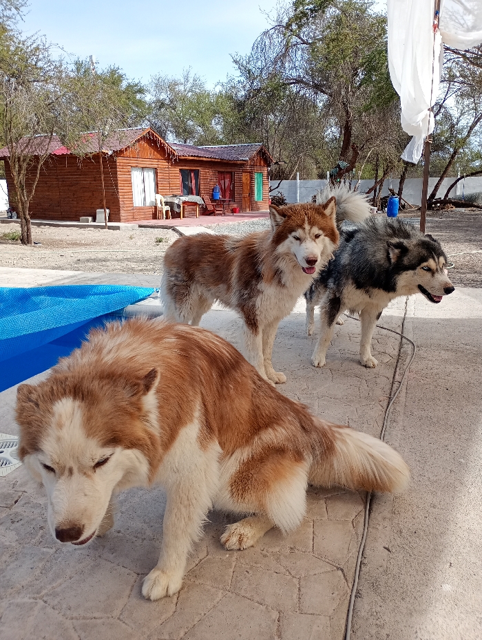This image depicts an outdoor scene in Pozo Almonte, Chile, featuring three large dogs and a wooden cabin structure
