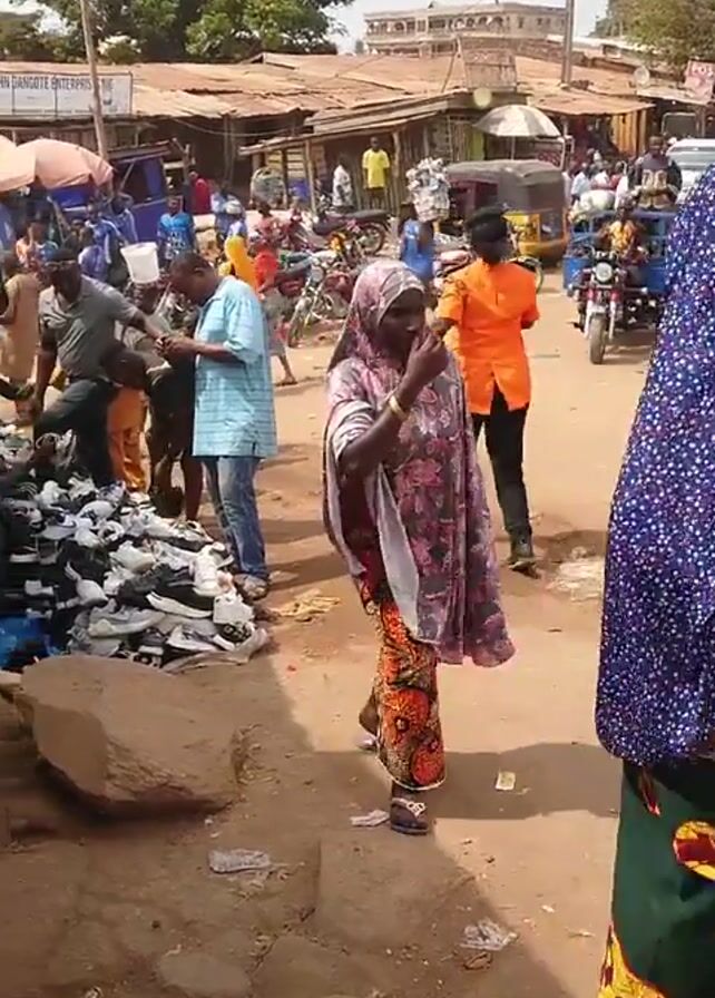 busy marketplace in what appears to be a West African country. Several people are gathered around a pile of shoes, apparently for sale. People are inspecting the shoes. A woman in a colorful headscarf and dress walks by, followed by another woman in similar attire. There are small shops or stalls in the background with corrugated metal roofs. Motorcycles and other vehicles are parked nearby. The ground is dusty and littered with trash. The scene conveys a sense of bustling commercial activity.
