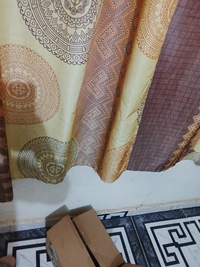 The image depicts tan and brown patterned curtains hanging against a white wall. The curtains feature geometric designs, including circles and diamonds. Below, two cardboard boxes sit on a tiled floor with a black and white geometric pattern. The overall composition is a close-up shot focusing on the texture and patterns of the curtains and the immediate surrounding environment.
