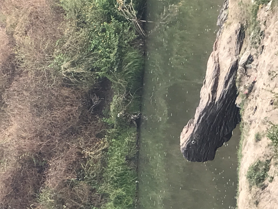 A water body, possibly a river or large stream, flows alongside a bank. On the right, a large, weathered rock formation sits at the edge of the bank, with sparse vegetation. On the left, vegetation varies from dry, tangled bushes to patches of green grass and shrubbery along the water's edge. The water's surface is slightly rippled, reflecting the surroundings.