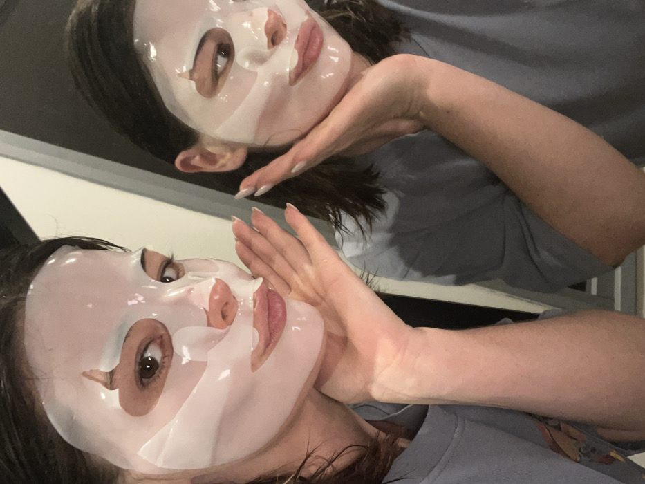 Two women, seemingly the same person reflected, wear white sheet masks on their faces, obscuring their features except for their eyes and lips
