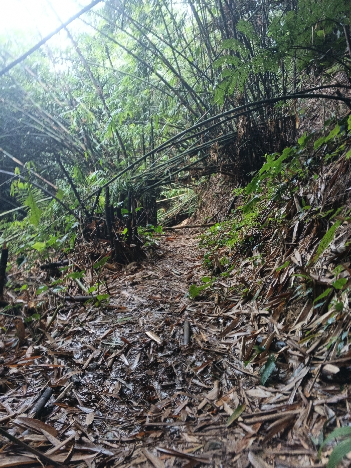 The image displays a narrow, unpaved trail traversing a dense bamboo forest in Baglung, Nepal. The path is muddy and heavily covered with a thick layer of wet, decaying bamboo leaves and debris. Dense bamboo culms, varying in diameter and height, form a prominent canopy overhead and line the steep, rising terrain on both sides of the trail. The ground immediately adjacent to the path, particularly on the right, exhibits exposed soil patches interspersed with leaf litter and scattered green ground cover. No human individuals, animals, or artificial structures are visible within the frame. The environment is characterized by dense natural vegetation, consistent with a humid, forested ecosystem.