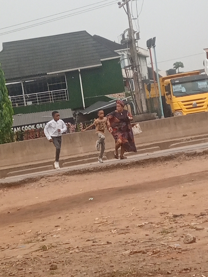 A daytime scene depicts three individuals in motion across a concrete barrier or median in an urban environment under an overcast sky. In the foreground, a rough, reddish-brown dirt expanse contains scattered debris. From left to right, a young male, appearing to be a pre-teen, wears a white long-sleeved shirt, dark trousers, and white sneakers, with his right foot raised. Next, a younger male child in a light-colored graphic t-shirt, light trousers, and sneakers holds the hand of an adult female to his right, with his left foot off the ground. The adult female, wearing a dark patterned dress, a headwrap, and carrying a light-colored handbag, walks with her right foot raised. All three are moving from left to right. In the background, a two-story building with a dark green facade and a dark sloped roof is visible, featuring a sign partially reading "AN COOK GRIL." To the right of the building, a tall wooden utility pole supports multiple wires and equipment. Further right, traffic light fixtures are mounted, and a yellow dump truck is partially visible on a paved road. The location is an unspecified city in Unknown, Unknown.