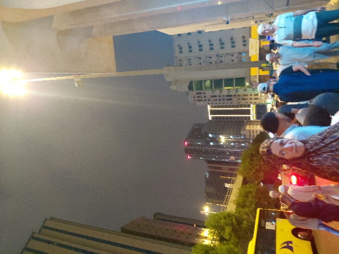 A group of people, some wearing head coverings, stand near a city street with skyscrapers in the background. Some are dressed in casual clothing, while others wear more formal attire. A yellow bus is visible, possibly indicating a public transportation stop. The scene seems to be taken in the evening or late afternoon, judging by the lighting.